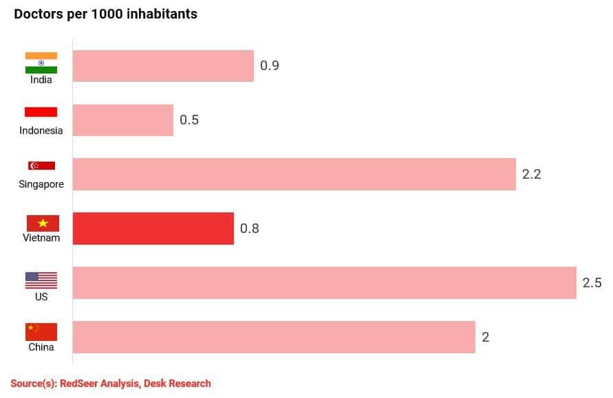 While hospital beds ratio is reasonable, Vietnam suffers from an acute shortage of doctors. There are 0.8 doctors per 1000 inhabitants which is in line with other developing nations, but signifies a supply gap that can be bridged through eHealth.