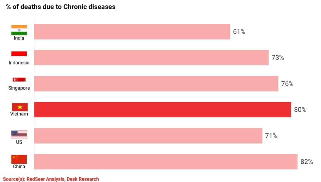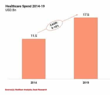 Driven by rising disposable incomes for a decade and high share of chronic diseases, the overall Vietnam healthcare market has grown rapidly at 9-10% CAGR in 2014 – 19 to reach $ 17.5 Bn, in 2019.