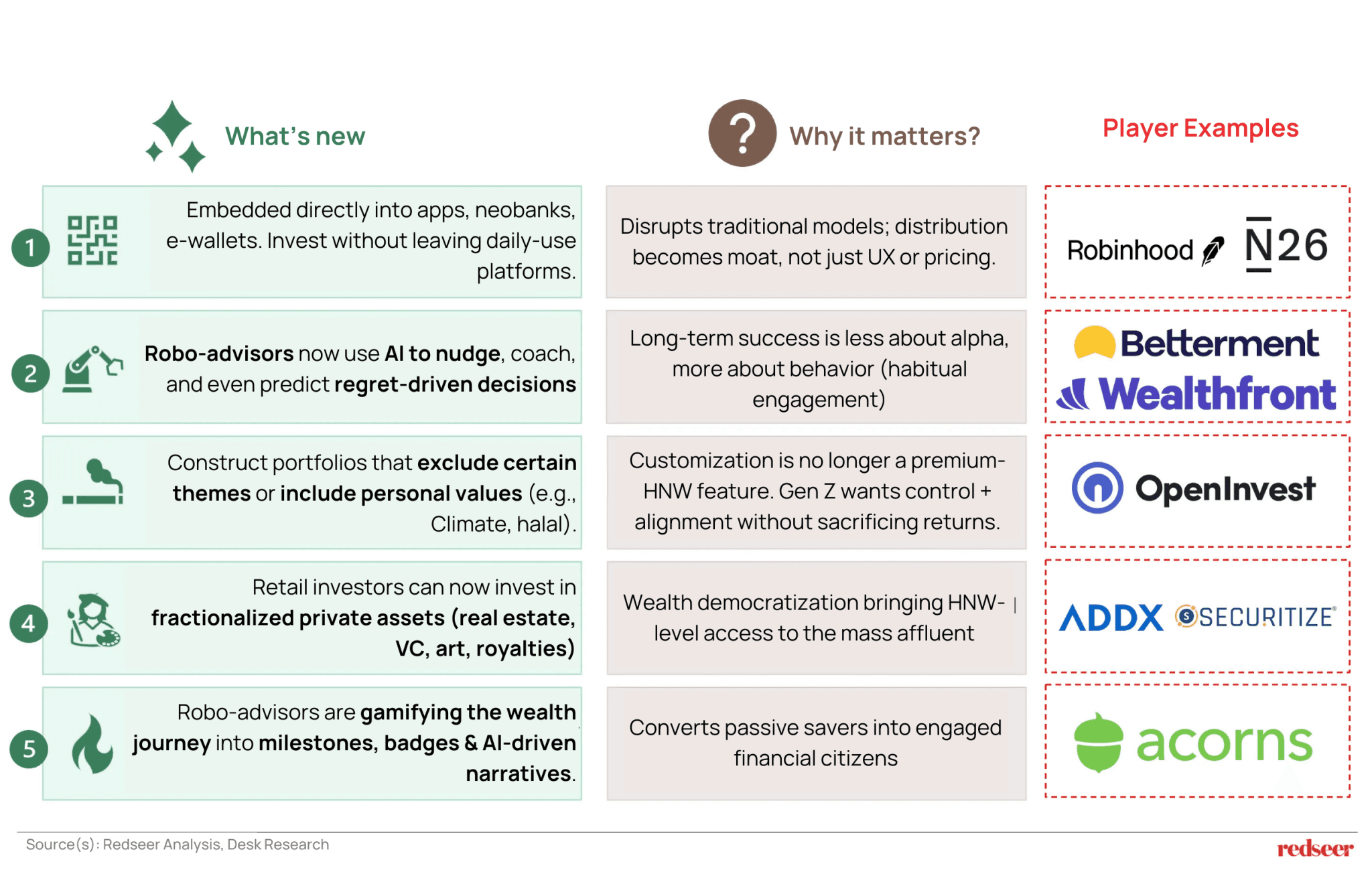 Globally, players are integrating innovations that are redefining the investor experience; from ethical investing to AI prods to fractionalized alternative holdings