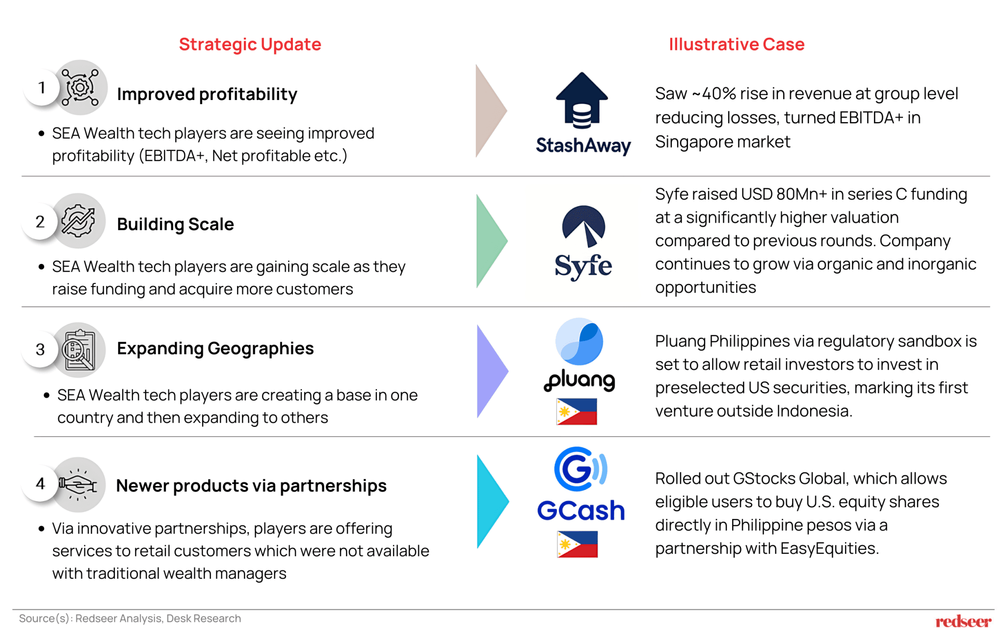 SEA wealth tech players are progressing from early-stage disruption to sustainable scale and profitability. The shift from burn-driven growth to EBITDA-positive operations (e.g., Stash Away) reflects maturing business models. Simultaneously, players like Syfe and Pluang are scaling rapidly via funding and cross-border expansion, signaling strong investor confidence. Partnerships enabling differentiated offerings (e.g., GCash + EasyEquities) demonstrate how firms are filling product white spaces traditionally underserved by incumbents.