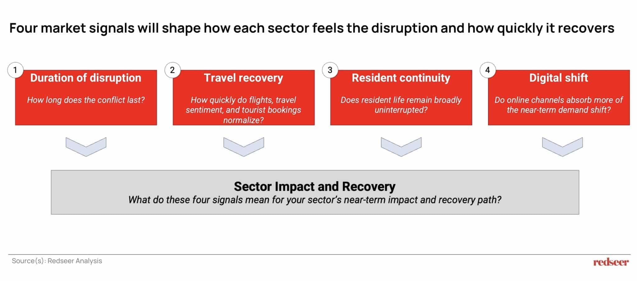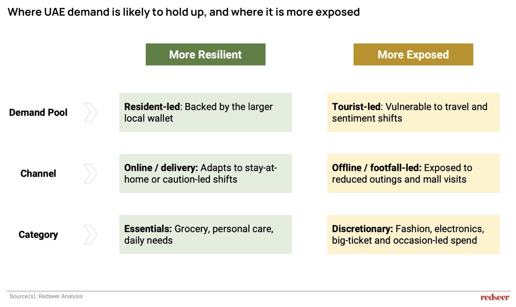 In this backdrop, a few questions need to be answered before we outline the expected impact. First, how long does the disruption last? Second, how quickly do flights, travel sentiment, and tourist bookings normalize? Third, does resident life remain broadly uninterrupted, since that protects the larger share of the UAE consumer wallet? Fourth, do digital channels absorb more of the near-term demand shift? And finally, what do these four signals mean for your sector’s outlook and recovery path?