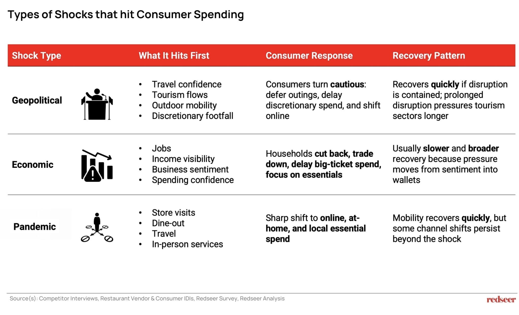 - Political and geopolitical shocks hit sentiment, mobility, travel, and discretionary demand first.