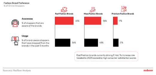 The evolution of fast-fashion platforms catering to instantaneous trends and style-hungry shoppers is at the very core of the increasing share of wallet among online fashion shoppers. This preference among online shoppers for fast fashion culminates in unprecedented high frequency rates for online fashion shopping. This is also reflected in the relatively higher awareness & conversion for fast fashion brands.