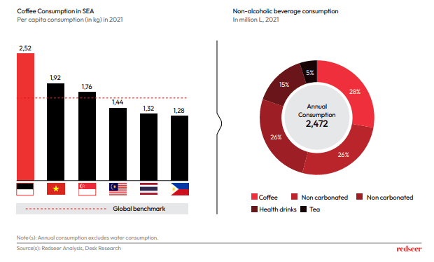 Indonesia has the highest per capita coffee consumption in SEA. High population along with significant local production (4th largest coffee producer in the world) provides strong local demand-supply dynamics for Indonesia’s coffee industry. In 2021, coffee consumption exceeded ~690Mn L, which gives the highest contribution for non-alcoholic beverage category