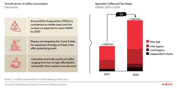 The new-age coffee chains that weathered the pandemic phase have now emerged stronger to cater to the structural uptrend in coffee/beverage consumption. The increased growth in coffee and tea shops are due to the rising middle class population which is expected to be 160Mn by 2030, new market penetration in Tier 2 and 3 cities as it offers the highest income growth, and innovation and new products offering.