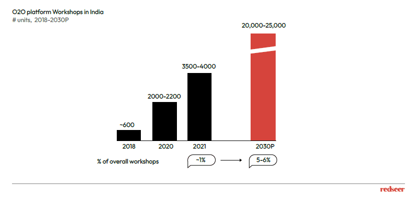 The penetration of O2O workshops in India was less than 2% in 2021. But they are gaining share rapidly, To the workshop partners, they offer better lead generation, easier spare sourcing and an overall increase in business. The customers get the convenience of the online process and organised workshop quality service at lower costs, a critical element for the value-conscious Indian consumer.