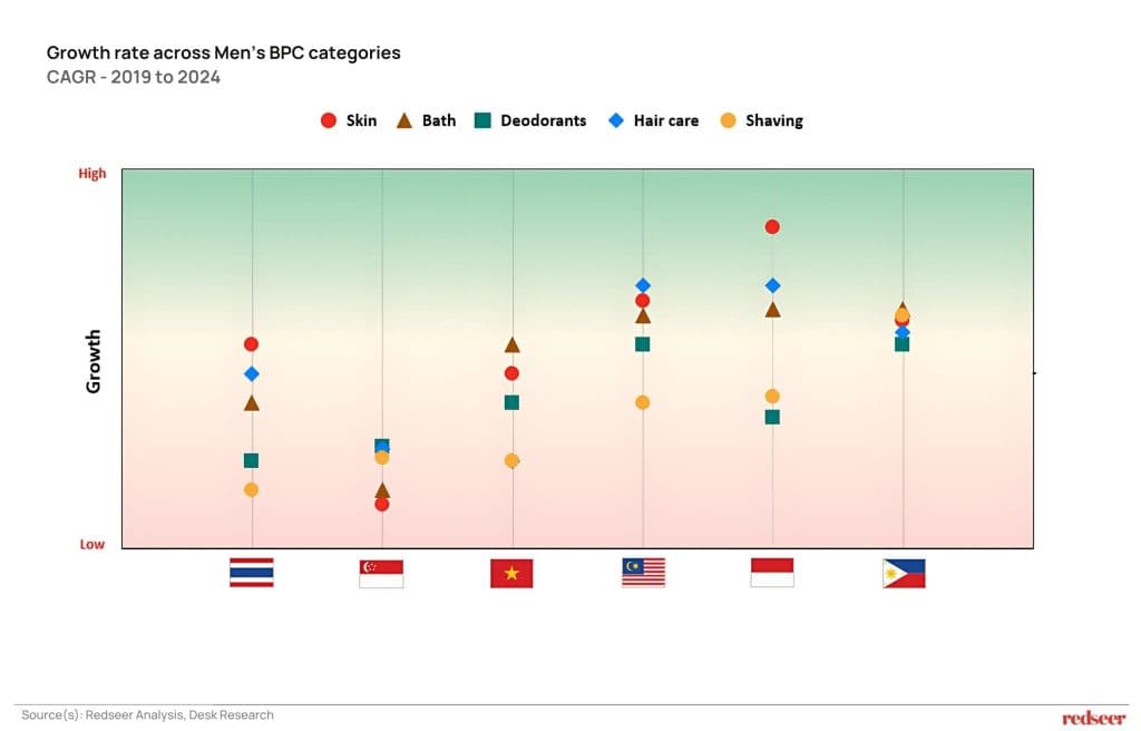 The men’s grooming category is positioned in a high-growth, low-competition quadrant, making it strategically attractive. SEA markets such as the Philippines, Malaysia, and Indonesia are leading the growth curve with 9–12% CAGR which is 2x of other prominent markets and even ahead of other large developing markets like India and China.