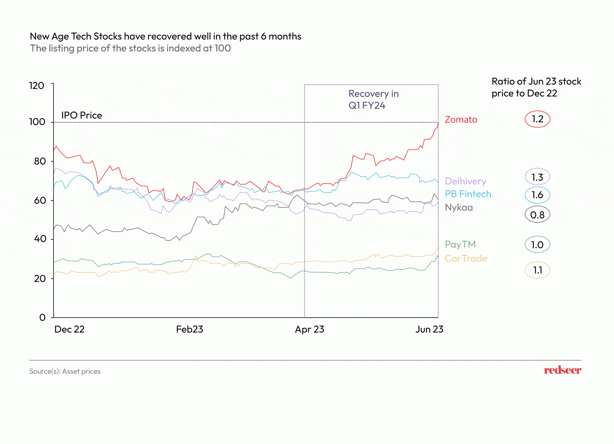 After a period of sharp correction, listed new-age tech players have recovered significantly. Recovery has been driven by strong performance of these companies on business fundamentals, especially strong showing on the profitability front. Also, as the market understands these models better, pricing is expected to be increasingly based on business fundamentals as opposed to tangential factors.