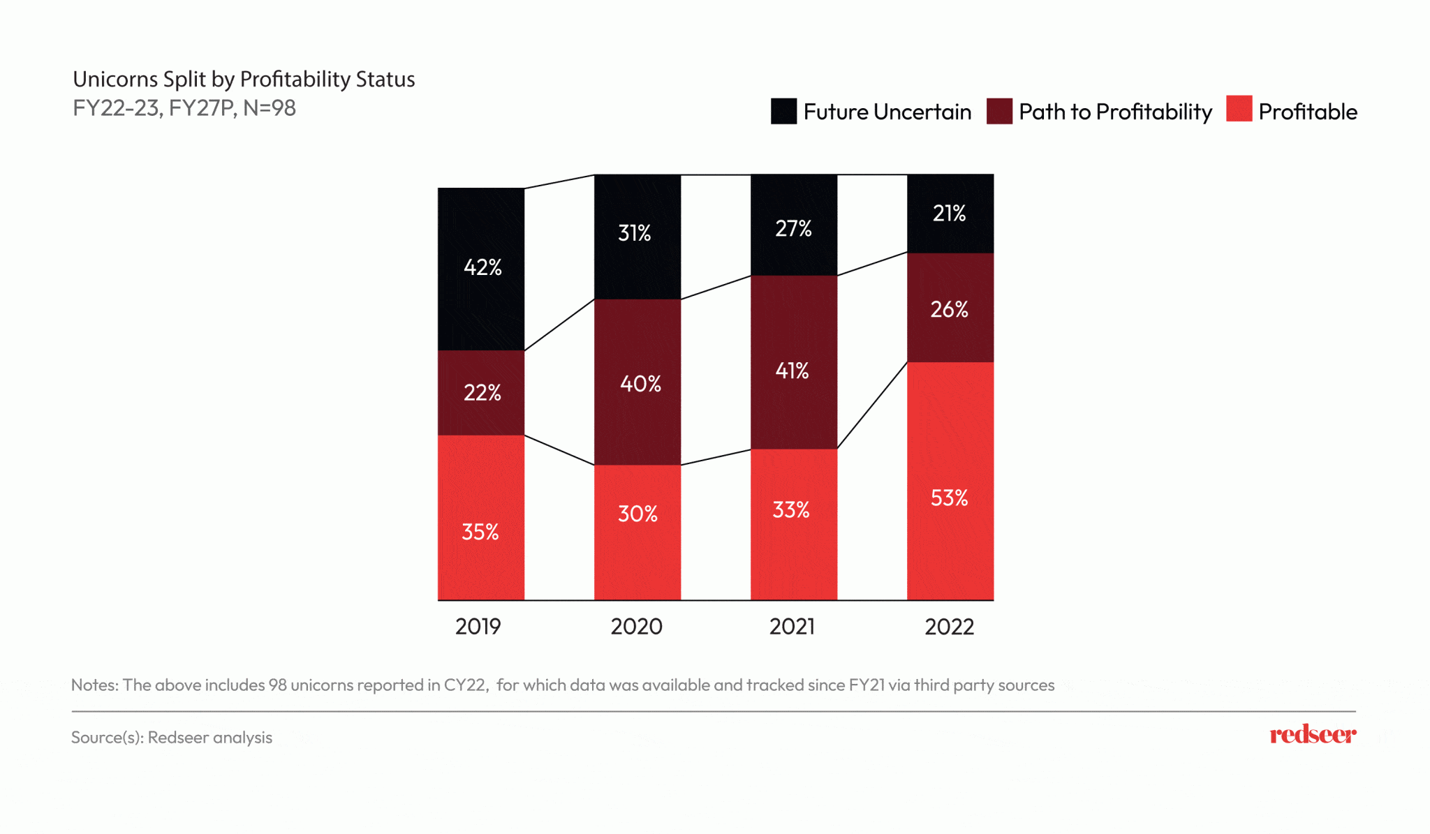 New-age tech players have been focusing on profitability with decisive calls to optimise costs with one eye on maintaining high growth. This will result in a sizable pipeline of IPO-ready companies in the next 5 years. Our study concludes that startups have substantially improved their profitability in FY22, with 50% of the same unicorns expected to become profitable by FY27. However, multiple things must fall in place for success. ~20% of the unicorns will likely struggle under regulatory challenges, unclear business models, and plummeting demand. Some of these are expected to close, pivot to new models, or get acquired.