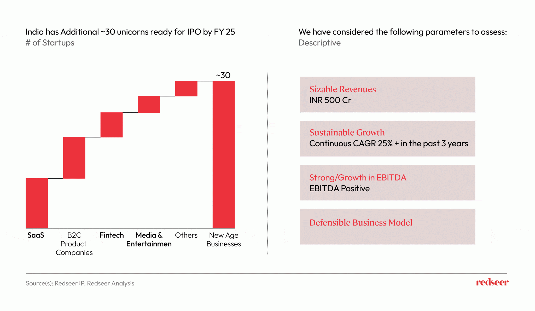 Apart from the already listed/soon to be listed new-age companies, there are upwards of 30 new-age business that will get IPO ready by FY25 (resulting in the aforementioned 40 IPO-ready companies). Businesses with the highest potentially IPO-ready companies are SaaS, FinTech, and B2C Product Companies, Media & Entertainment. We have chosen these startups based on their strong performance across various metrics. They have sizable revenues of INR 500 Cr or more along with a defensible business model. They are EBITDA positive and have demonstrated sustainable growth with CAGR of 25% in the last 3 years. Getting there requires not only great numbers but also focus on several intangibles.