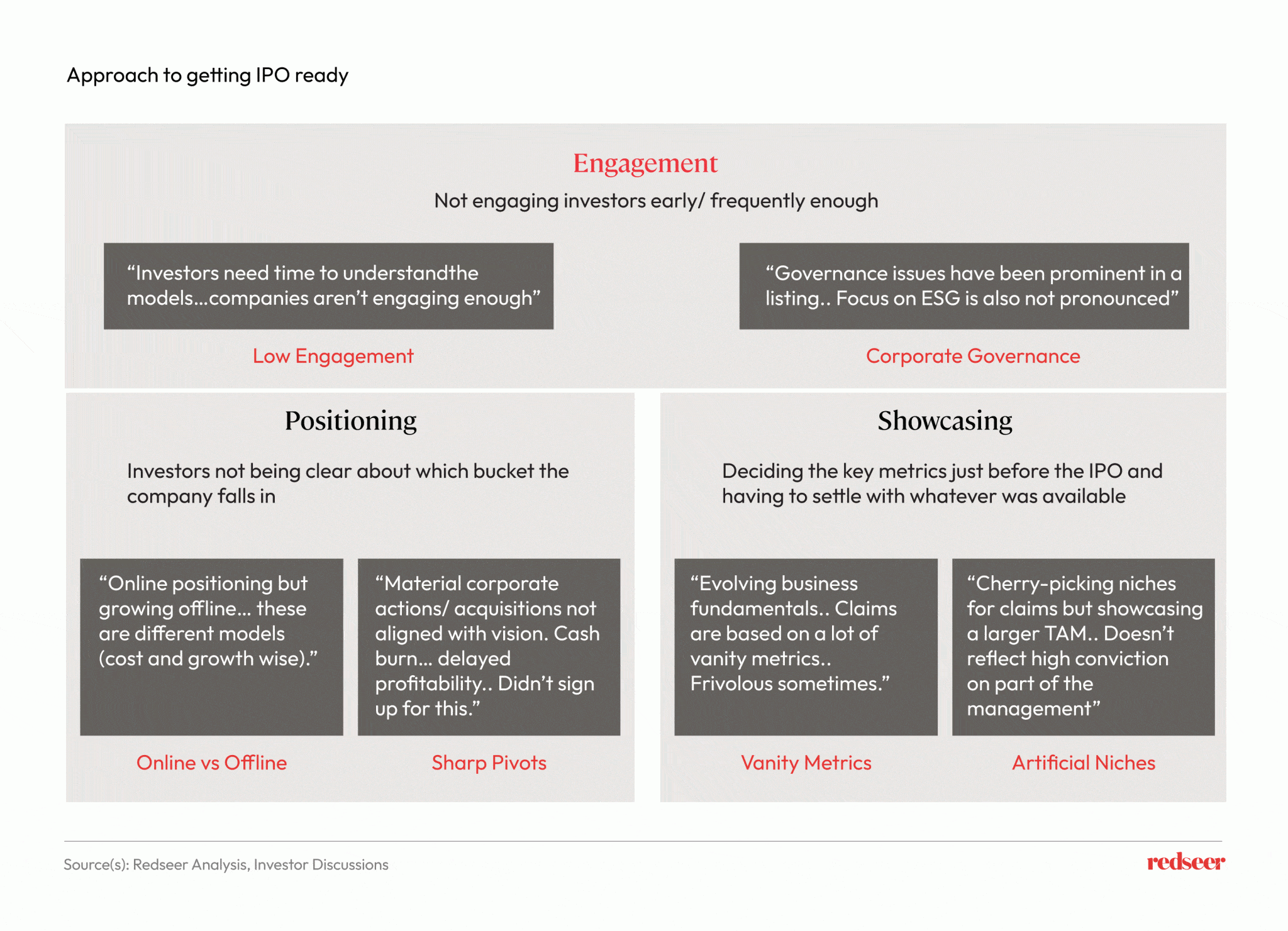 Improving across the key metrics required planned efforts over at least 2-3 years for the numbers to be sustainable. However, more importantly, being able to position the company in the right bucket in the investor’s mind while showcasing why the companies are best-in-class in the buckets is paramount. All while engaging the broader investor community (including the public market investors) years before the IPO, as it takes time for the investors to truly absorb, understand and familiarize themselves with the business models and comfort with corporate governance. Therefore, Positioning the company well, Showcasing their abilities through the right metrics and Engaging investors continuously as they travel this journey towards IPO should be one of the mantras of IPO-bound companies.