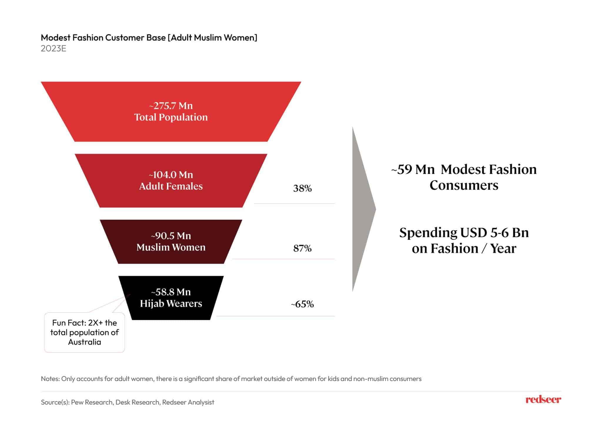 While the market is not only limited to Muslim Women. They form one of the biggest consumer cohorts are directionally give a very good sense of how big the market is. Across the world, it’s estimated there are 500-800 Mn women that wear Hijabs. In Indonesia alone, there are ~59 Mn Adult Women. Almost double the size of the entire country of Australia! This translates to USD 5-6 Bn worth of modest fashion opportunities just for adult women while the market extends beyond this as well.