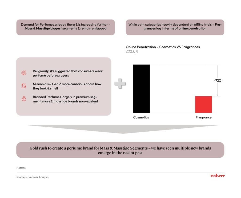 Brands have largely catered to the premium perfume market, leaving the mass market with limited options like deodorants or unbranded perfumes. However, driven by cultural trends and the evolving needs of younger consumers, there’s a growing demand for a mass perfume brand. This category also lags in online penetration compared to similar beauty and personal care (BPC) categories, where offline trials are important.  Fun fact, it’s estimated that in China ~25% of perfumes are sold online. Recognizing this opportunity, multiple brands are now entering the mass perfume market, and we’re already seeing success stories emerge in both online and offline channels.