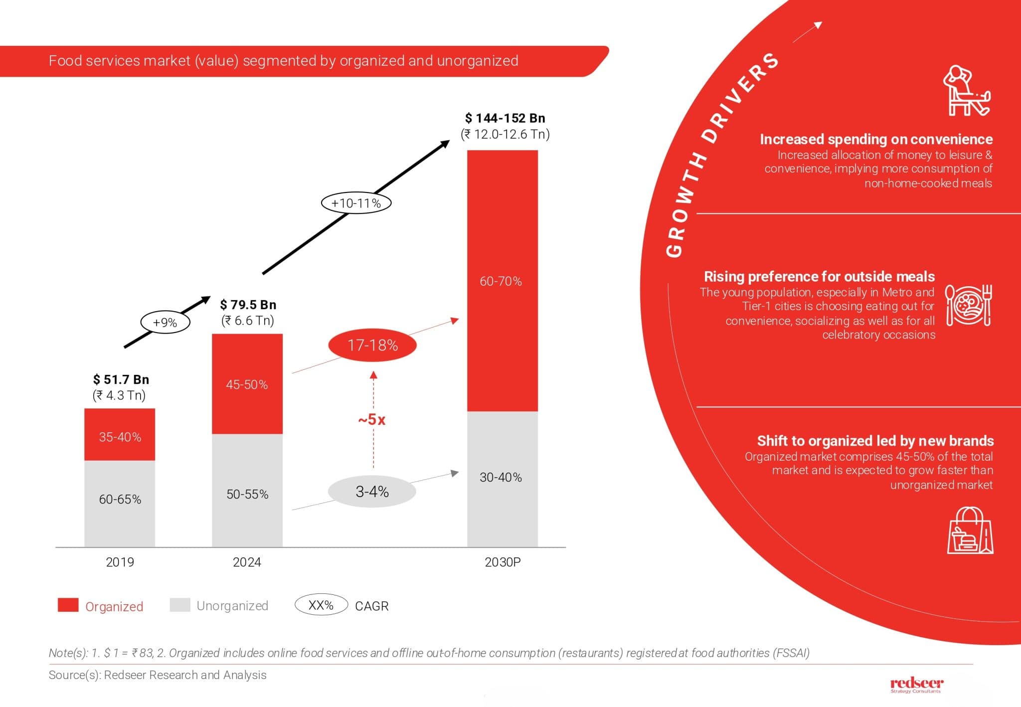 The organized sector currently constitutes approximately half of the overall food services market but is growing significantly faster than the unorganized segment. This expansion is fuelled by two key drivers: