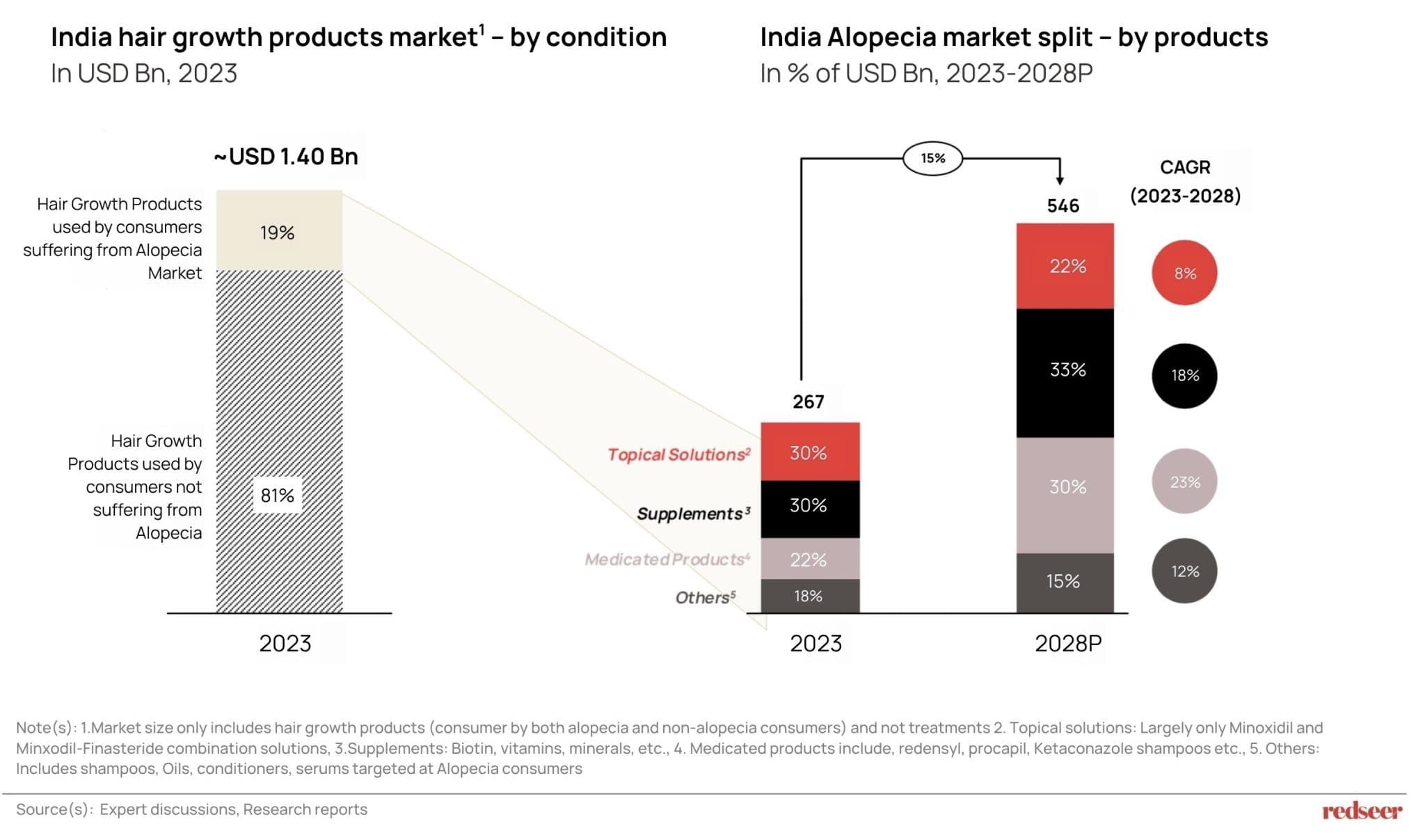 Hair loss is quietly moving from a pharmacy transaction to a shelf-bought category in India, and the shift is happening faster than the industry has acknowledged. The alopecia-driven hair growth market, worth USD 267 Mn in 2023, is set to more than double by 2028. Underneath the headline number, the category mix is rearranging; supplements are compounding at more than twice the pace of the topical solutions that historically built this market.